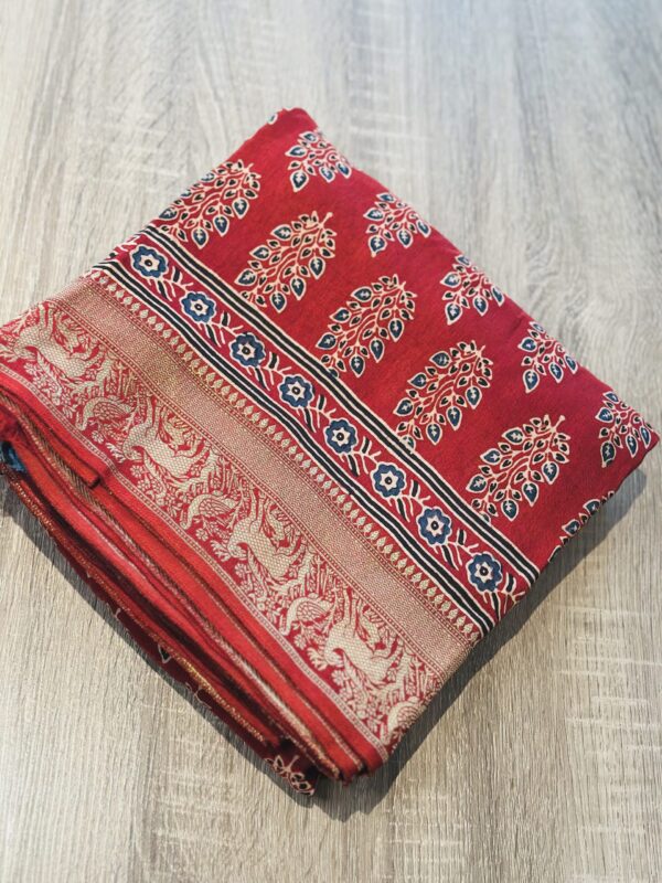- AC246 , Ajrakh Hand Block Printed Saree in Premium Dola Silk with Golden Zari Booti Blouse